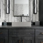The iconic “Woods” wallpaper in black and white adds a classic, organic element that echoes the surrounding landscape, while a concrete sink, black fixtures, and cast bronze hardware reinforce the room’s natural feel.