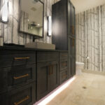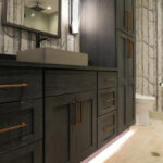 This master bath is a striking blend of rustic style and cutting-edge technology, thoughtfully designed around its standout feature: a black and white weathered cabinet finish. Unique and full of character, the finish sets the tone for the space, perfectly suiting the homeowners’ style.