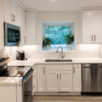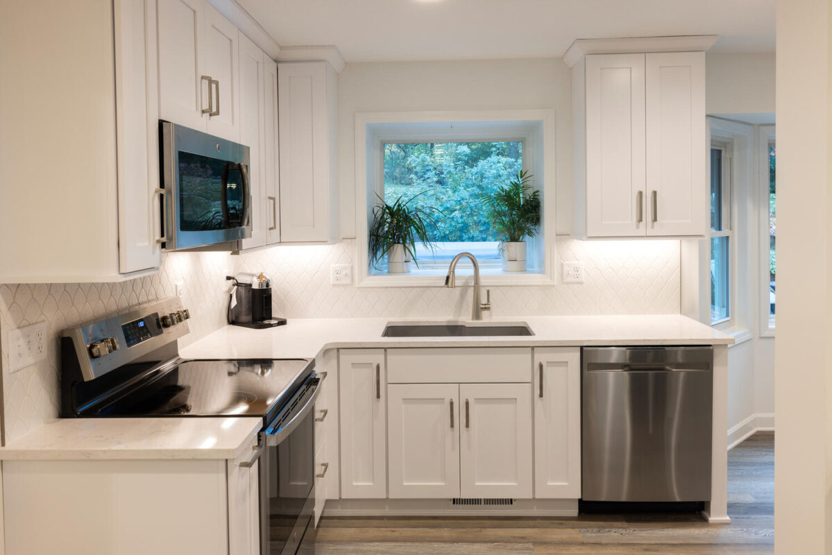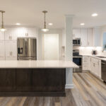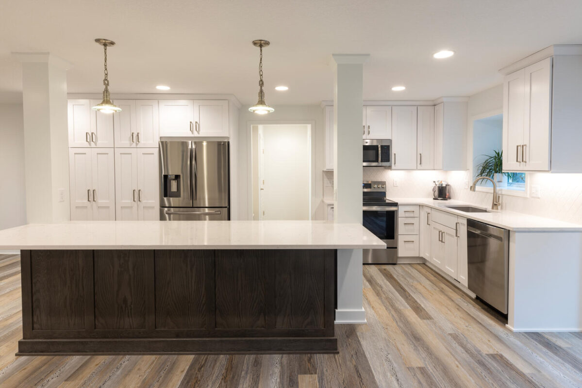 The remodel came with its fair share of challenges—including the late-stage addition of columns flanking the island to accommodate existing electrical and a vent stack. To maintain the clean, streamlined look the homeowners envisioned, custom oversized doors were installed on the end cabinets to conceal extended stiles, allowing for seating on each end of the island without sacrificing design integrity. A stained red oak panel adds durability and warmth to the back of the island, offering a rich contrast to the surrounding white cabinetry and tying the space together with subtle sophistication.