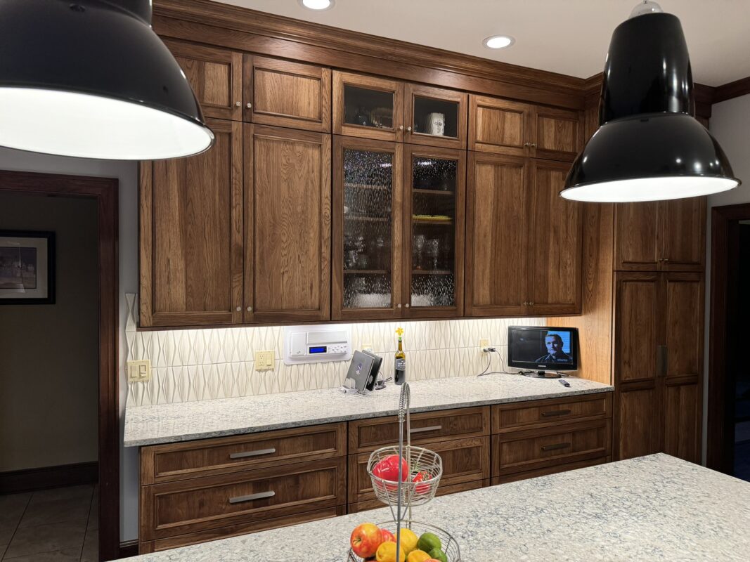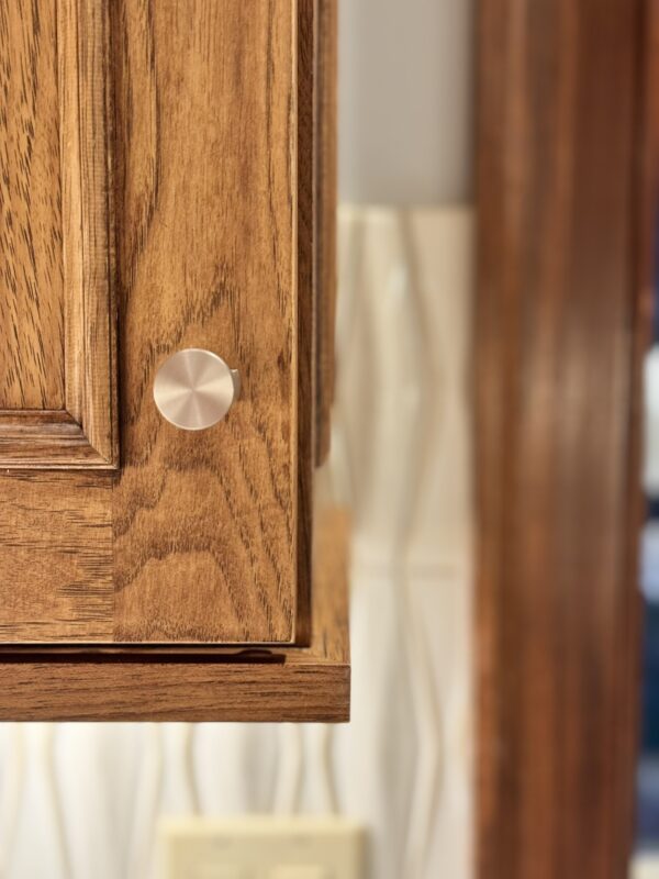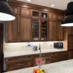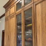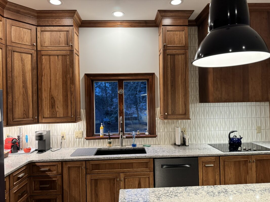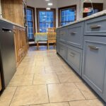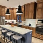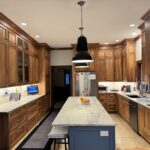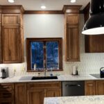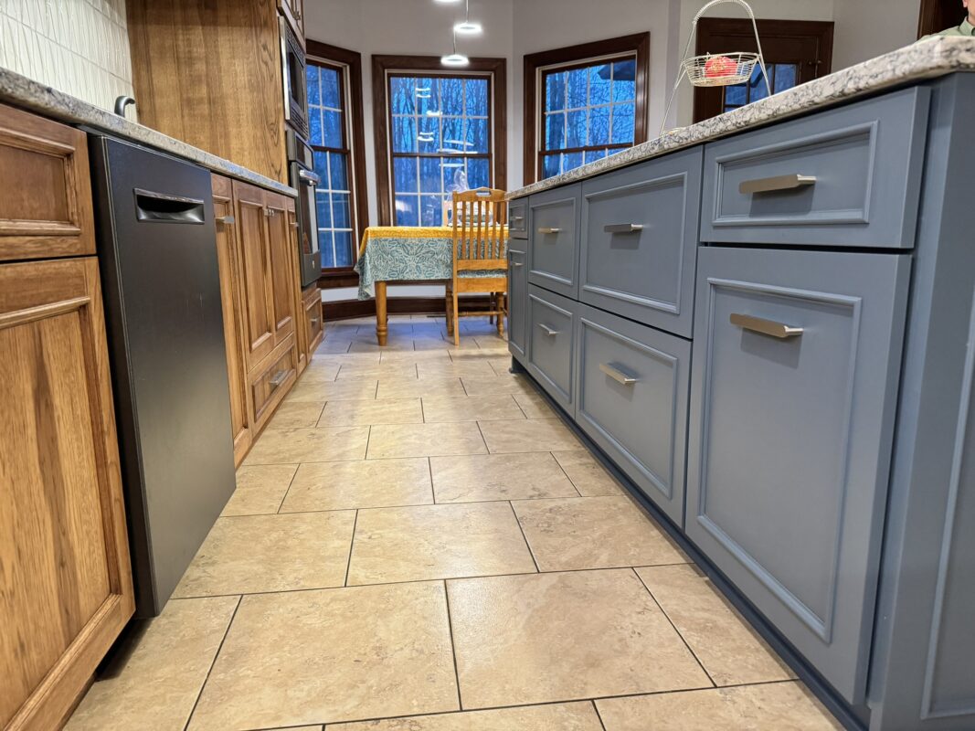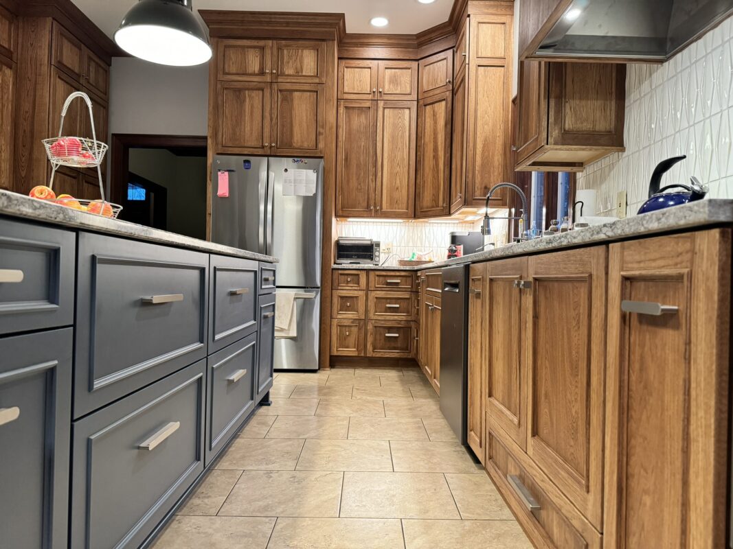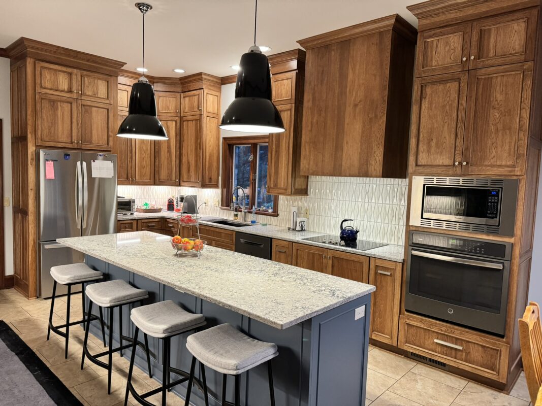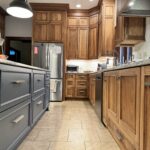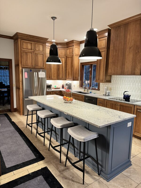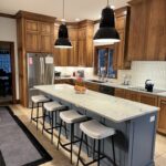 Soaring ceilings and an artistic spirit set the stage for this rustic-modern-castle kitchen. A bold Smokey Blue island commands the room, grounding the space with color and character. Large windows frame sweeping views of wooded hills and a babbling creek, blending the interior seamlessly with the landscape. This kitchen isn’t just a space—it’s an immersive experience that connects the home to its natural surroundings, creating a sense of place that’s both dramatic and welcoming.