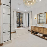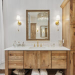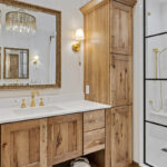 This timeless master bathroom blends contemporary style with the natural warmth of rustic hickory cabinetry, creating a serene retreat that reflects its stunning surroundings. Nestled on riverfront property in the mountains, the home called for a design that felt both modern and grounded.
