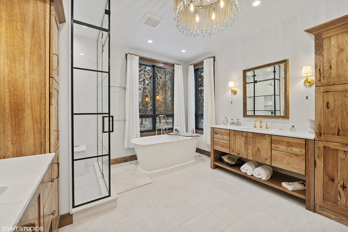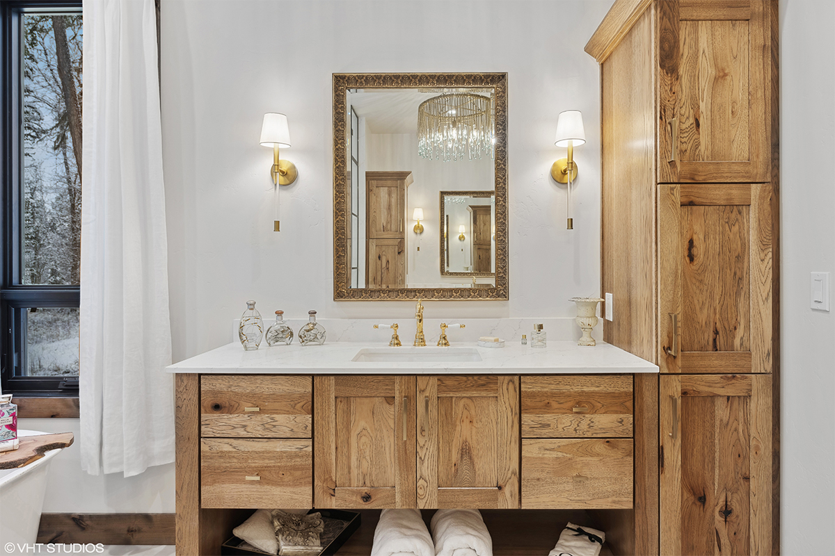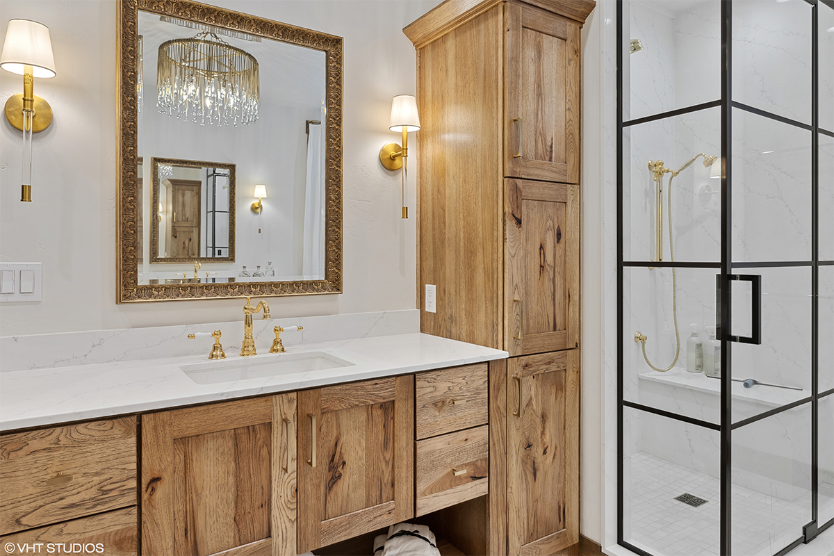 The warm hickory vanity anchors the space with rich wood grain and texture, seamlessly pulling the outdoors in and complementing the clean, sophisticated finishes throughout. The result is a modern yet cozy space that captures the spirit of Montana living—elegant, earthy, and effortlessly inviting.
