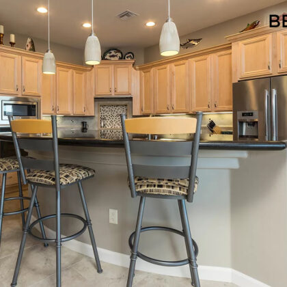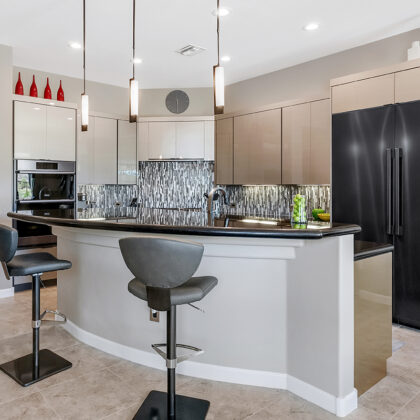 The new owners of this home loved the view and how it made them feel connected to nature, but not the pickled oak cabinets. With the help of the designers at Southwest Kitchen & Bath in Tucson, AZ, the entire home was completely transformed and modernized by refacing the existing cabinets with sleek high-gloss doors and drawer fronts.