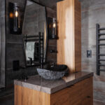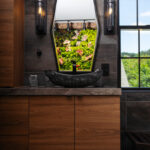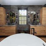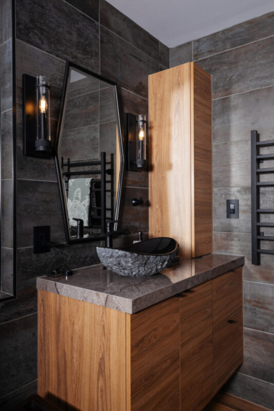Floating ShowplaceEVO Horizon vanities in Textured Metro Matte finish bring sleek sophistication to the space, topped with refined X-tone porcelain counters and dramatic hand-carved black granite vessel sinks. A wall-mounted bidet toilet and urinal set against vertical wood tiles balance rustic charm with modern utility.