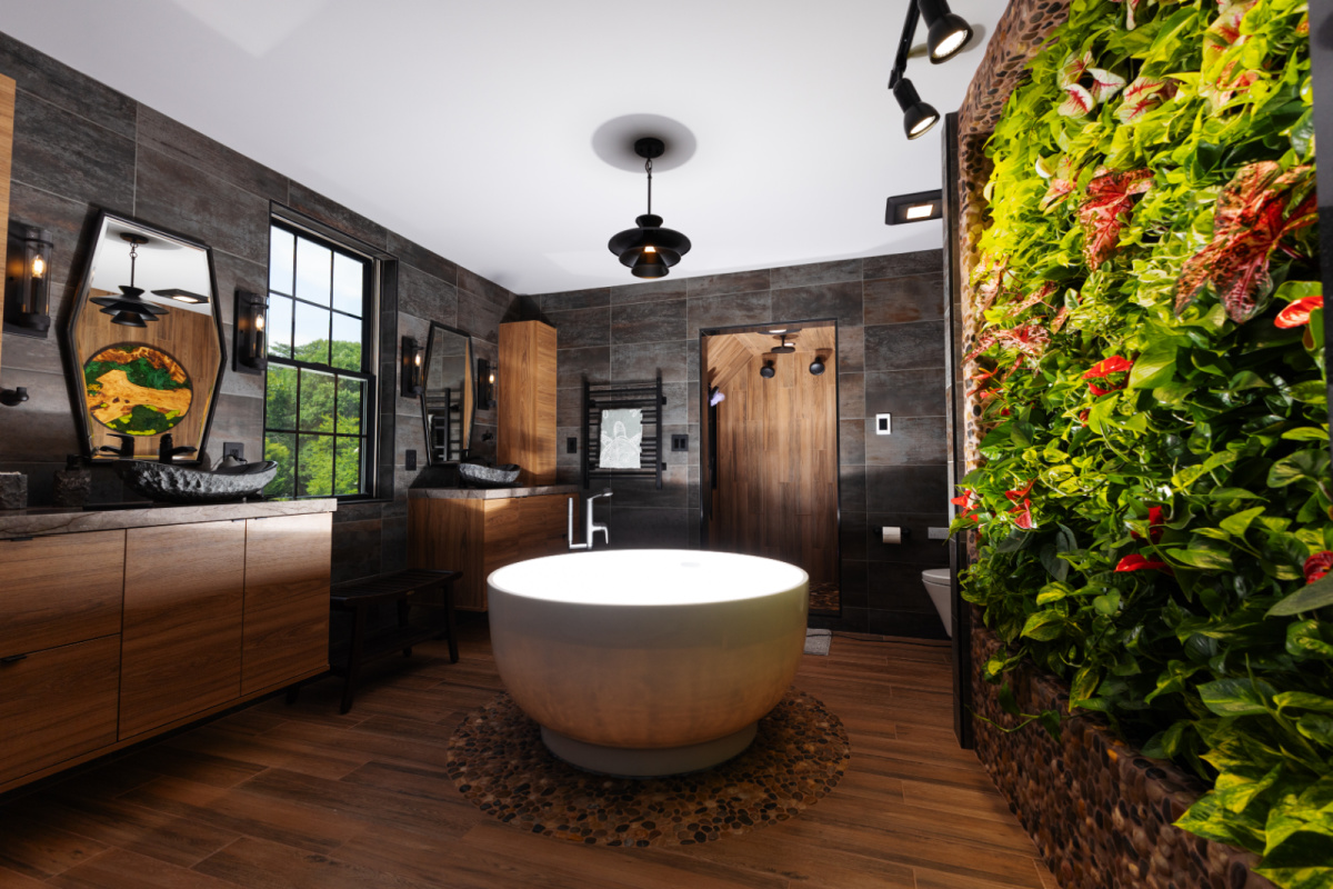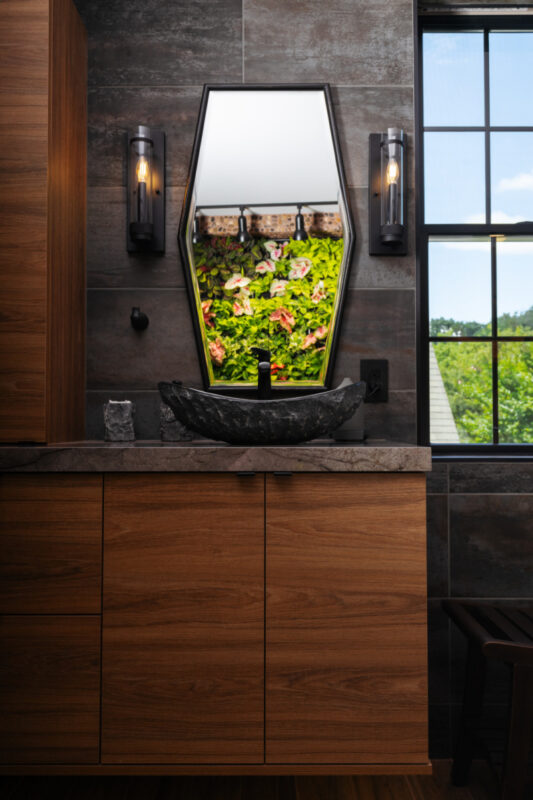 Nature takes center stage with a lush live plant wall, nourished by drip irrigation and lit by adjustable track lighting. Custom rosewood and moss wall art and hand-placed pebble stones around the tub and shower further connect this space to the natural world.