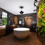 Step into this Contemporary Industrial Oasis, where raw materials meet organic textures to create a master bath that’s both edgy and serene. Iron oxide porcelain tiles wrap the walls in a rich, industrial hue, while wood grain porcelain flooring adds warmth underfoot—enhanced by integrated radiant heat for ultimate comfort.