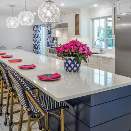 Although the space was long and narrow, they had a lot of appliances in mind, along with enough seating for large groups. A long island proved to be a great solution to their needs. Two ovens and a microwave were placed in the island, hidden below eye level; two dishwashers were also needed, disguised with matching panels to limit the amount of stainless that was visible. The combination of navy and white colors proved to be sophisticated, fun and timeless.