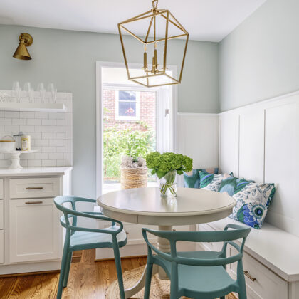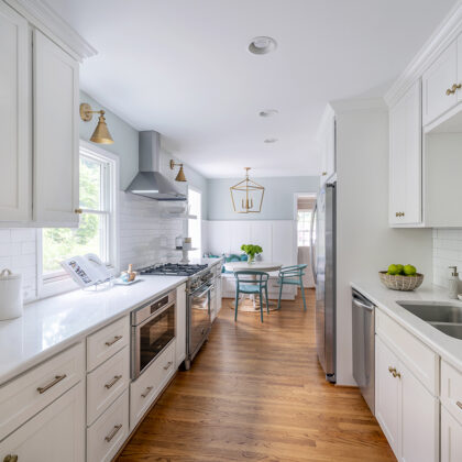 This small Galley Kitchen is bright and charming. Along with the large windows bringing in plenty of natural light, the sleek Showplace Pendleton door with White paint is the perfect combination to make this space seem as spacious as possible. The added Breakfast nook provides a place for friends and family to gather. It was also a great solution for a kitchen not large enough for an island.