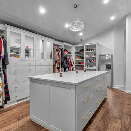 This luxurious walk-in closet adjoins the homeowners’ master suite. With a few essential criteria in mind—ample shoe storage, versatile hanging options, and an island with drawers—the design team embarked on creating a glamorous space that would exceed expectations. The homeowners adore the closet and have effortlessly filled every available slot. The vaulted ceiling provides additional vertical storage. Step into this stunning closet and experience the epitome of style and functionality.
