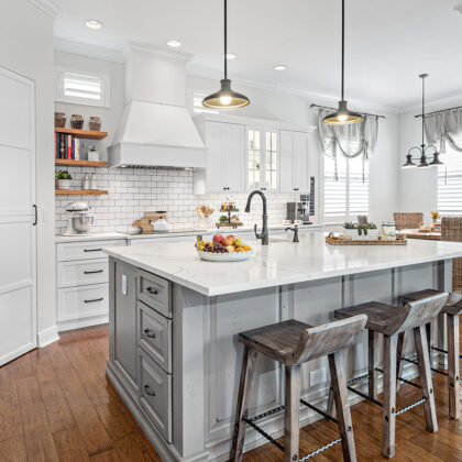 The bright feel of the perimeter in white paint opens up the entire space while the accent island provides plenty of space for food prep and eating. The owners are beyond happy about their new kitchen!