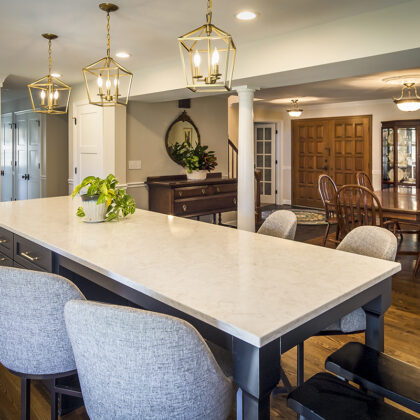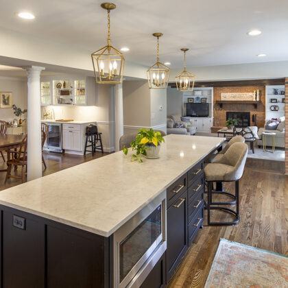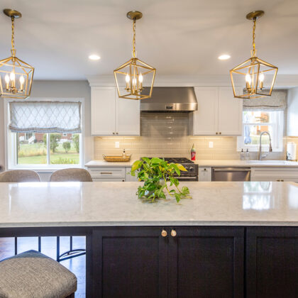 They love the added storage and the huge island with seating for entertaining family and friends. A big part of the the design is the classic black and white cabinets, from Showplace, with the satin brass accents. The homeowners did not want it to be too trendy, so they decided to keep the hardware simple and do more traditional lantern pendants in the gold finish.