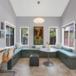 A custom green paint color was chosen to reflect the natural landscape just beyond the windows, bringing a sense of calm and continuity indoors. Quarter sawn white oak cabinetry adds warmth and subtle texture, perfectly complementing the homeowners’ custom dining table for a cohesive, collected look.