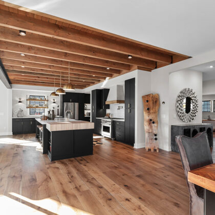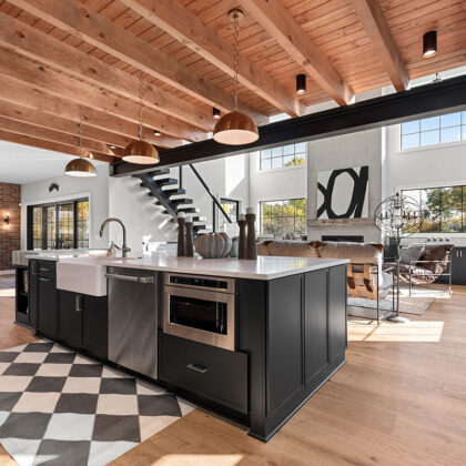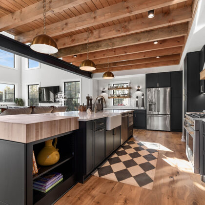 The mix of materials featuring the wood beams and ceiling above the open kitchen space makes it feel warm and inviting. This home is like on big parade of dreams.