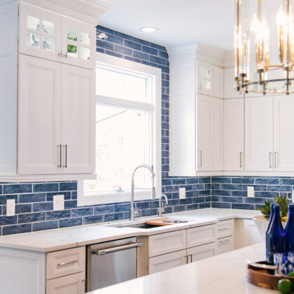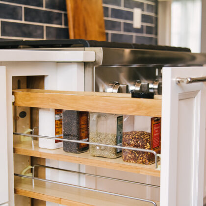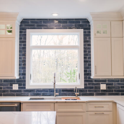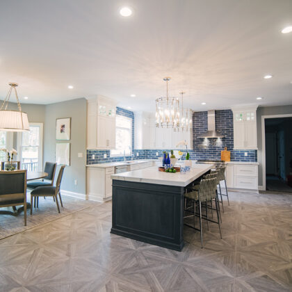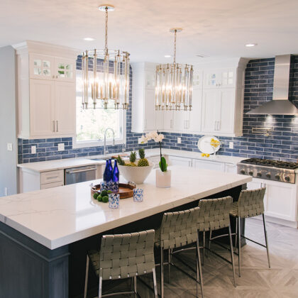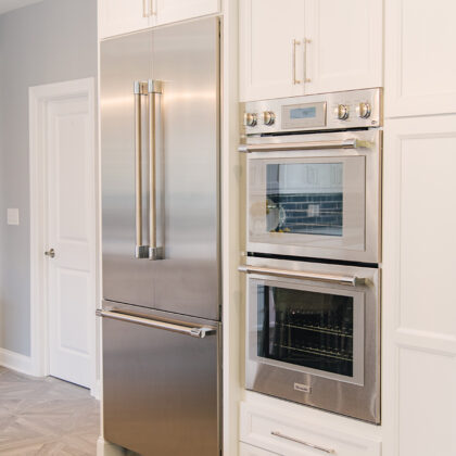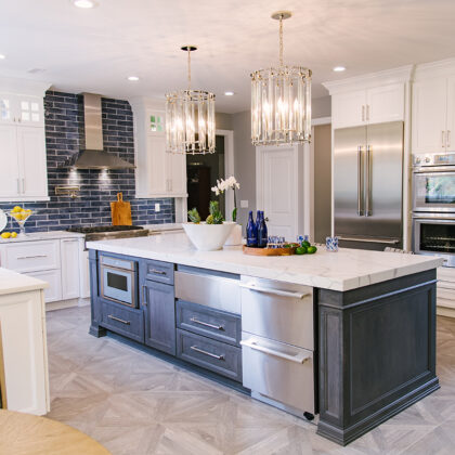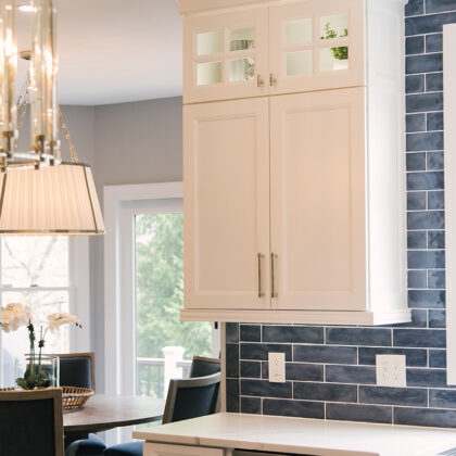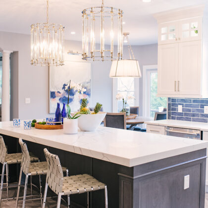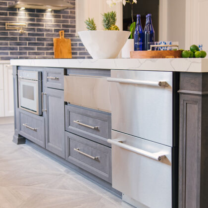 The homeowners wanted a true chef’s kitchen and desired to expand entertaining capacity within the space. With fine cabinetry from Showplace, they now have an immensely functional kitchen with storage capacity galore! A large transom window allows natural light to flow in and fill the space. It also provides a view to the resort-like back yard. A mitered edge quartz countertop on the Thunder-stained island offers plenty of seating for the food critics! A smartly-designed butler’s pantry, just off the kitchen, gives the space an additional bit of “bling” while providing additional hidden storage.