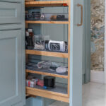 A custom color-matched paint, developed specifically to complement the wallpaper, sets the tone for the design. Hidden laundry is achieved through a walk-through pantry cabinet with custom pocket door hardware, allowing the washer and dryer to disappear when not in use. Thoughtfully designed storage incorporates a mix of doors, drawers, and roll-outs, while minimal seams keep the focus on elegant details like door beading and chamfered corners.