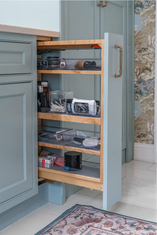 Key priorities included coordinating cabinetry with a bold wallpaper, concealing the laundry, maximizing hidden storage, and creating a dedicated display for the client’s unique handbag collection. The result is a space that seamlessly blends vintage Regency-era inspiration with classic Southern charm.