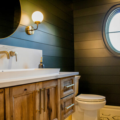 These homeowners were planning to remodel their powder bath and wanted a look that was visually impressive. The design came together perfectly with shiplap style walls painted emerald green paired with gold tone fixtures.