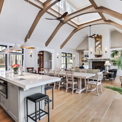 The homeowner wanted Showplace cabinetry from the beginning. They knew they wanted the Sterling door with white paint. The designer worked with the homeowner to add the gray island using the same door style. The room is open and inviting and leads out through large glass doors onto the pool deck. The kitchen is a wonderful example of the open floor plan gathering kitchen with inviting colors and clean lines. The decorative backsplash put the eye-catching finishing touch on this beautiful transitional kitchen.