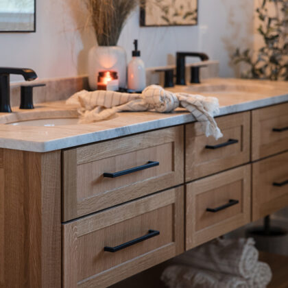 In order to accomplish this challenge, they chose quartersawn white oak in Natural stain, and chose a furniture style design for their Showplace vanity to create a spacious feeling. Along with the heated floors and water jets, the homeowner wanted the vanity to be a beautiful piece of custom furniture that had warm natural tones.