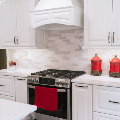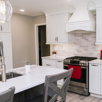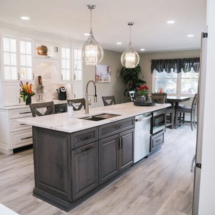 This homeowners desired to open up and combine their tiny kitchen into a larger room to the rear of the home. A full-width bearing wall was removed and a flush steel I-beam installed to combine the two spaces into one. This allowed the remodel team to design a large island with plenty of seating, while still preserving space for a separate dining room table and chairs.