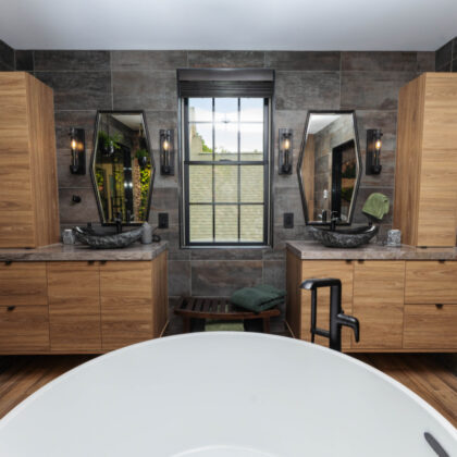 The homeowner selected ShowplaceEVO frameless cabinetry in Smokey Blue paint. The focal point in the kitchen was where they could place walnut cabinets. The pantries were the best place for that. So, she received a new, efficient kitchen with color as well as the walnut that she wanted so badly…all within budget.
