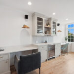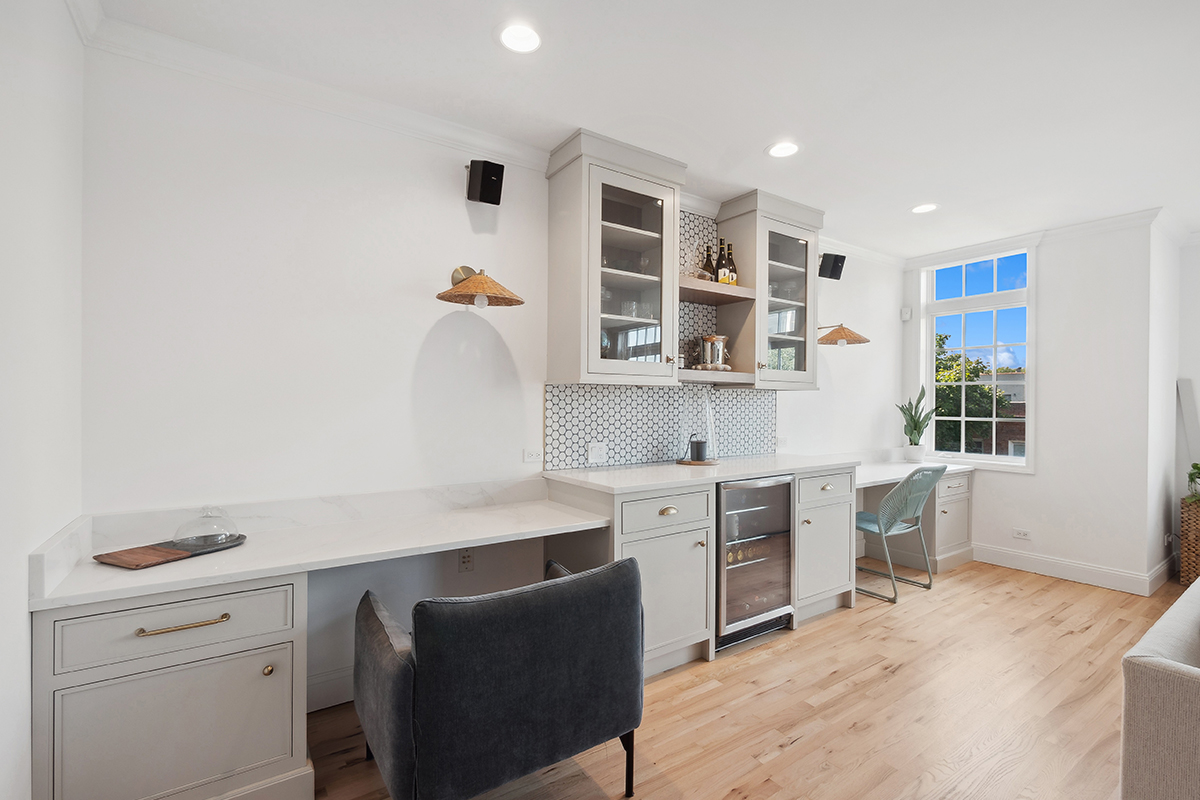 To make the most of the open layout, a multiuse desk and bar area offers both weekday workspace and weekend entertaining space—a perfect blend of form and function.