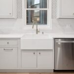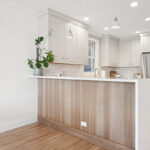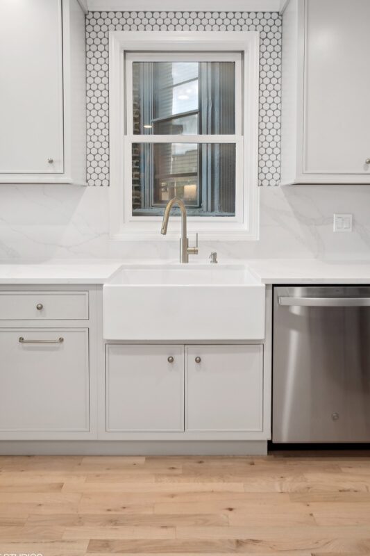 A waterfall quartz peninsula wrapped in shiplap makes a bold statement, while the quartz backsplash continues seamlessly beneath the upper cabinets. Around the window, quarter-sized round tiles add subtle texture and elegance.