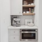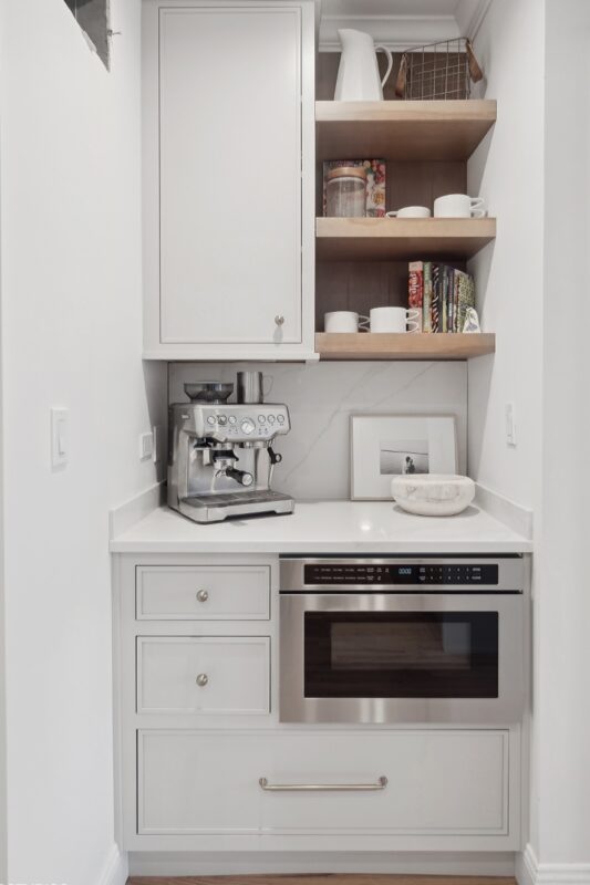 They chose Showplace Cabinetry’s Aspen door style in Accessible Beige for the kitchen, paired with Hickory Sparrow accents for added warmth and depth. A cozy coffee nook features custom cabinetry and vertical shiplap behind floating shelves—perfect for displaying their favorite mugs.