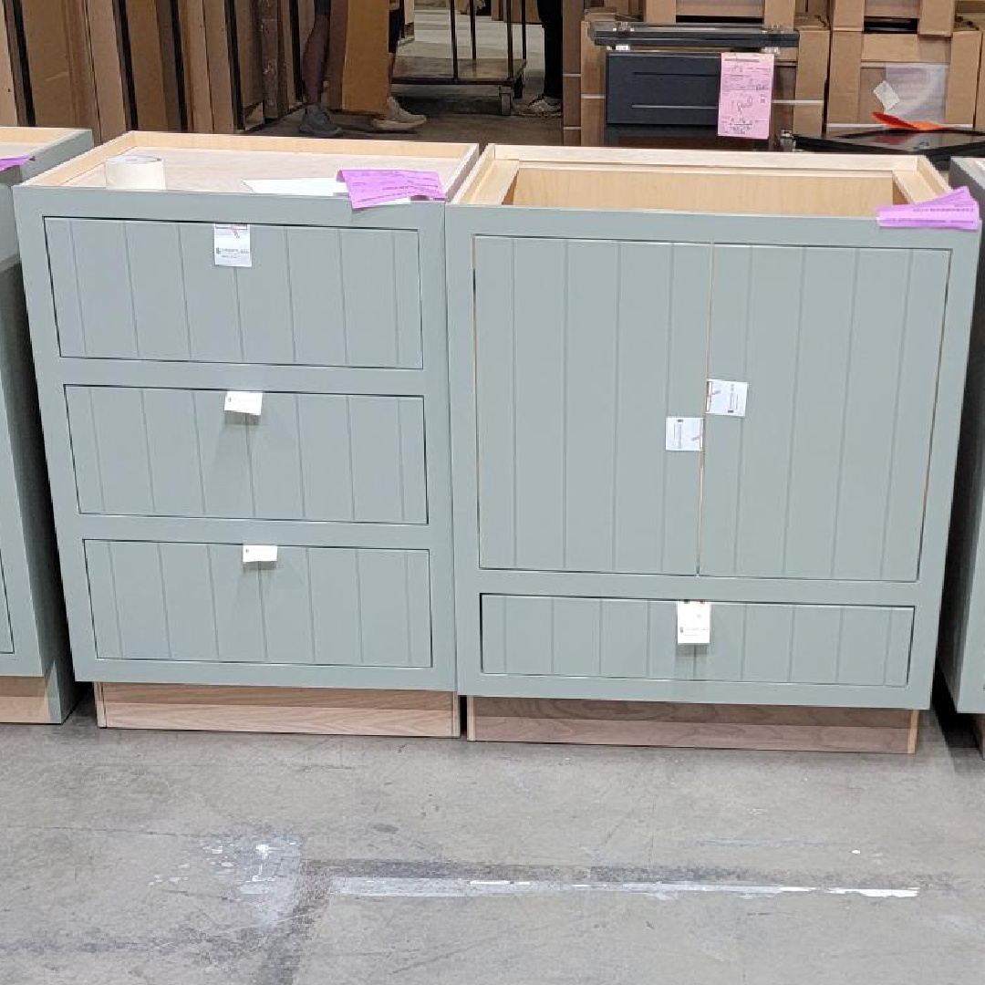 Base cabinets in a warehouse area, painted and includes the Lane door style with vertical grooves spaced apart equally on the door and drawer fronts.
